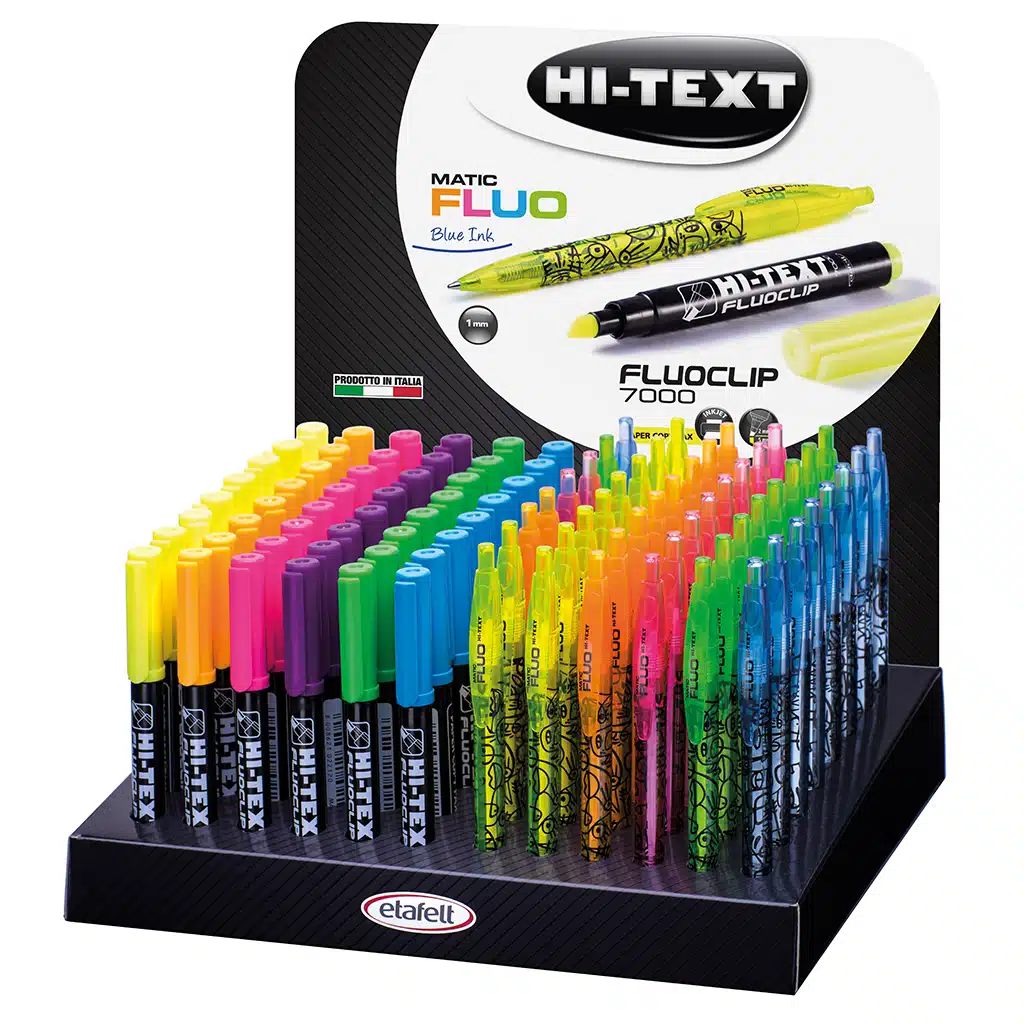 Il Display Fluoclip 7000 + Matic Fluo 910 è una soluzione completa e vivace per chi ama i colori accesi sia nella scrittura che nell’evidenziazione. Contiene 48 evidenziatori 7000 Fluoclip e 48 penne a scatto 910 Matic Fluo , entrambi caratterizzati da tonalità fluorescenti brillanti. Le penne offrono una scrittura fluida grazie alla punta da 1 mm e all’inchiostro blu, mentre gli evidenziatori con punta a scalpello da 1-6 mm sono perfetti per sottolineature decise e ben visibili su ogni tipo di carta. Il display è ideale per punti vendita e cartolerie.