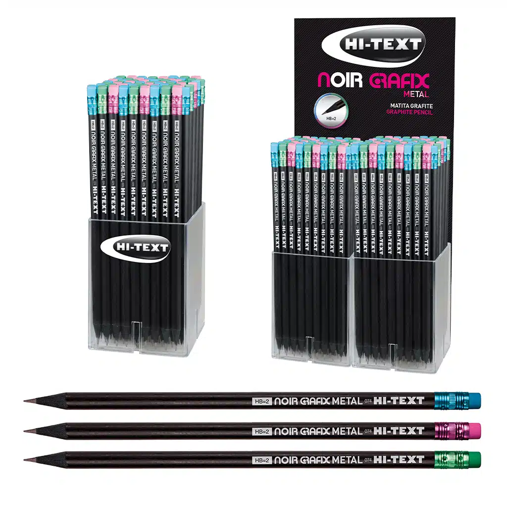 074 Noir Grafix Metal è una matita di alta qualità, ideale per scrittura e disegno tecnico. Realizzata in legno laccato nero, presenta un design elegante con ghiera e gommino in colori metallici. La mina HB=2 garantisce un tratto scorrevole, preciso e uniforme, perfetto per appunti, schizzi e lavori di precisione.